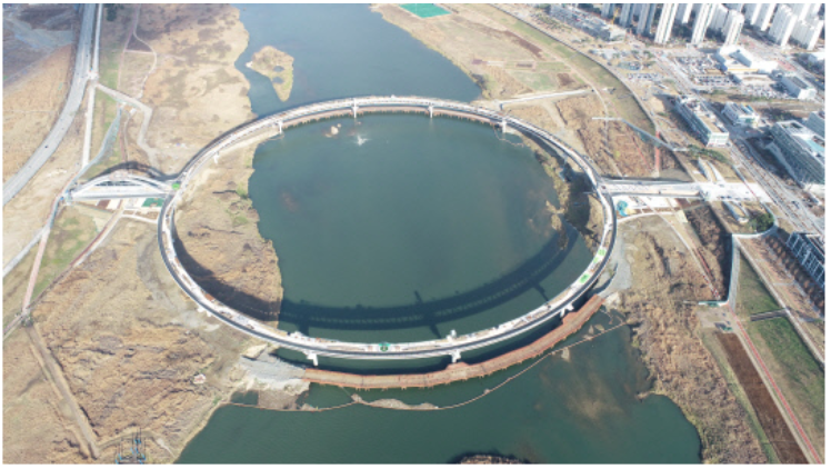 세종 행복도시의 구조를 형상화했다는 원형 디자인과 국내 최초로 주경잔강 110미터가 되는 복층 강관트러스트교라고 합니다. 상층은 보행로, 하층은 자전거도로로 이용할 수 있는 구조로 되어서 보다 안전한 이용이 가능합니다.