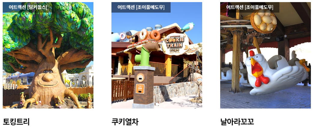 특별히 눈에 띄는 놀이기구는 국내 최초 도입된 롤러코스터라는 '자이언트 디거'와 워터코스터인 '자이언트 스플래쉬'입니다. 자이언트디거는 1000미터 정도 되는 트랙을 따라 시속 100이 넘는 속도로 높은 곳에서 내려오며 그 스릴감이 넘치게 하는 롤러코스터이고, 자이언트 스플래쉬는 최대 45미터나 되는 높이에서 시속 100에 육박하는 속도로 내려오며 물살을 가른다고 합니다.