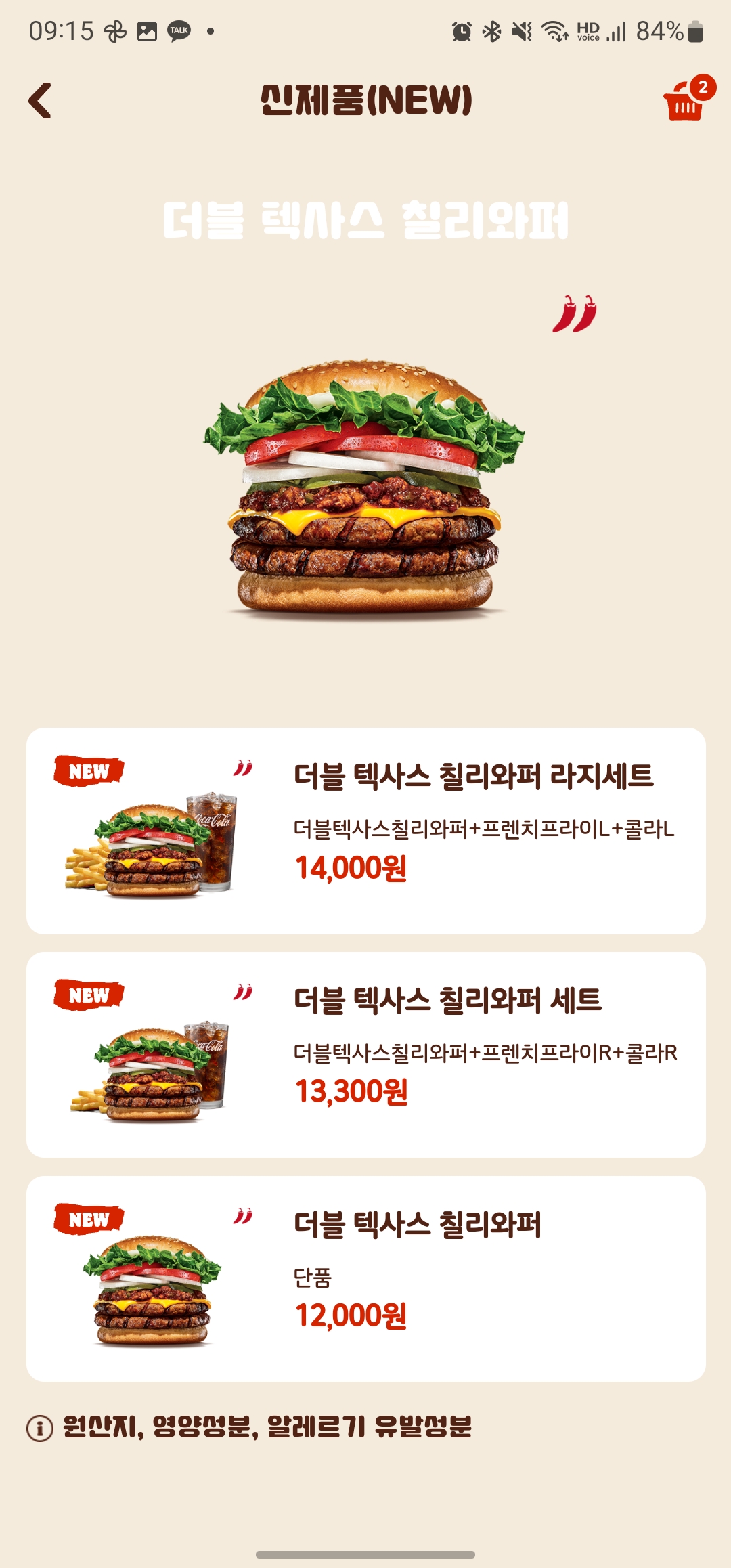 새로운 버거 메뉴인 더블 텍사스 칠리와퍼 가격을 정리합니다.