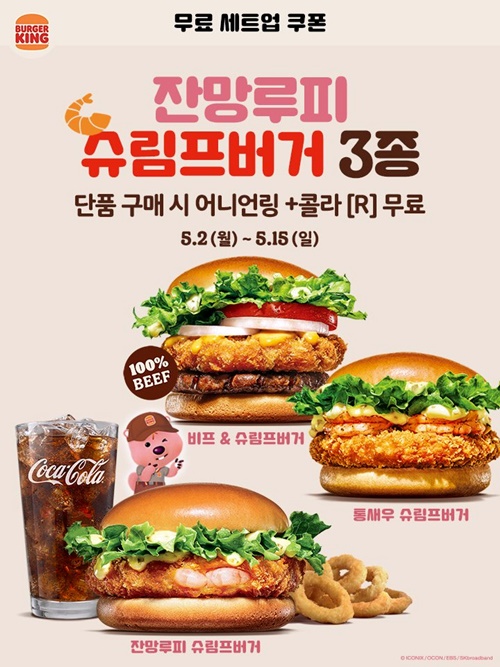 새콤한 레몬에 달콤한 벌꿀을 넣은 루피 특제소스를 사용한 슈림프버거 3종에 대해서 무료 세트업 쿠폰을 받을 수 있습니다.