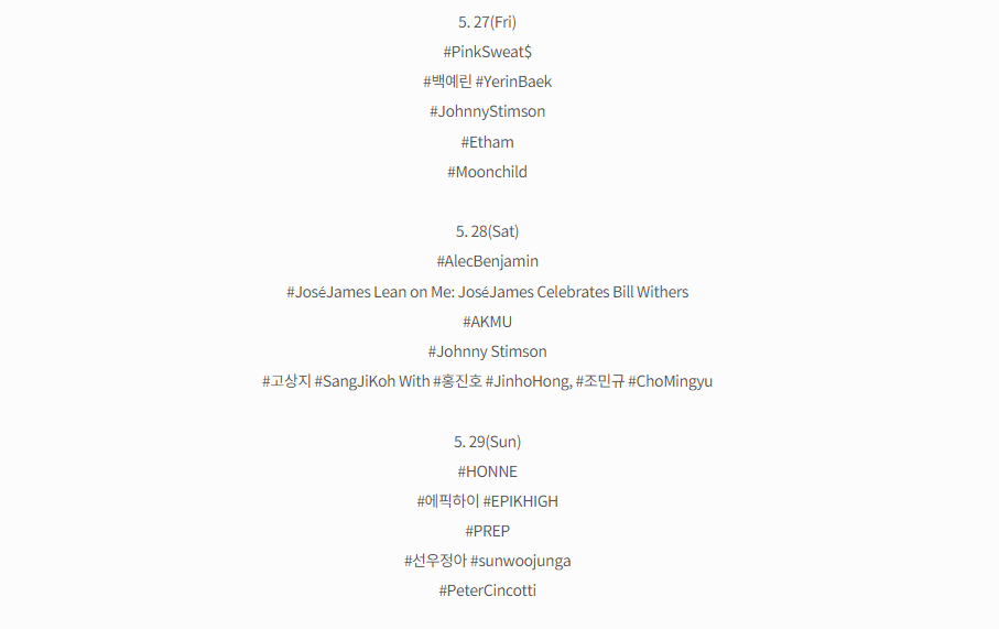 핑크스웨츠, 백예린, 조니스팀슨, 이담, 문차일드, 알렉벤자민, 호세제임스, AKMU, 조니스팀슨, 고상지는 홍진호와 조민규가 함께 나오고, 혼네, 에픽하이, 프렙, 선우정아, 피터신코티 등 화려합니다.