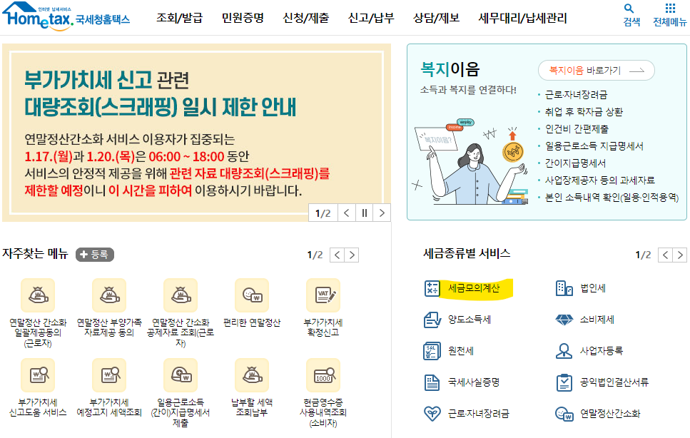 - 홈택스 - 화면 우측 아래의 세금모의 계산으로 접속
