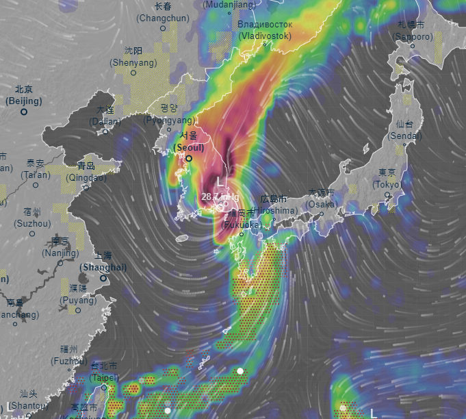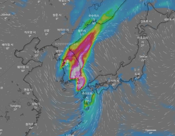태풍 경로는 바람만 표시해도 충분하니까, 아래 링크에서 우리나라 부근의 모습을 직접 실시간 확인해 보세요.